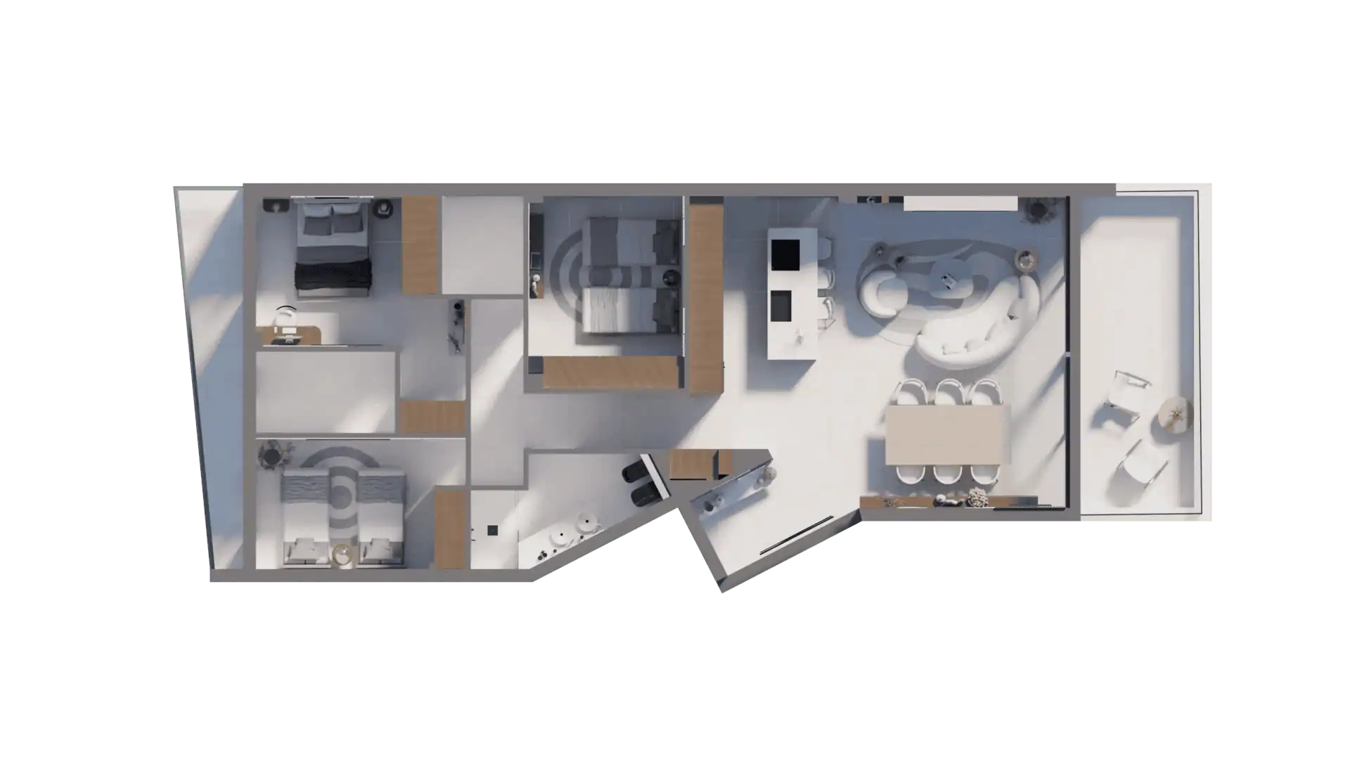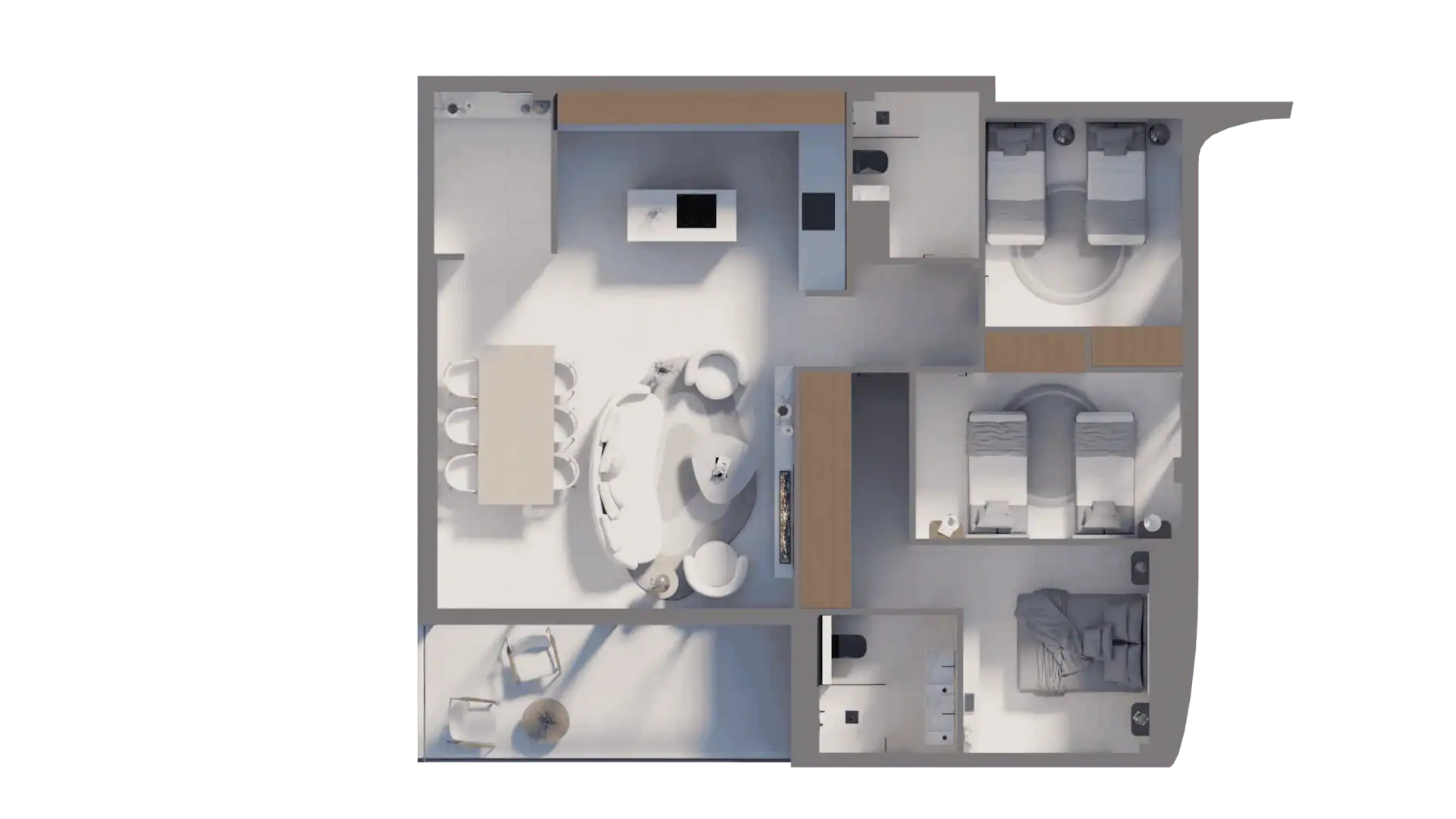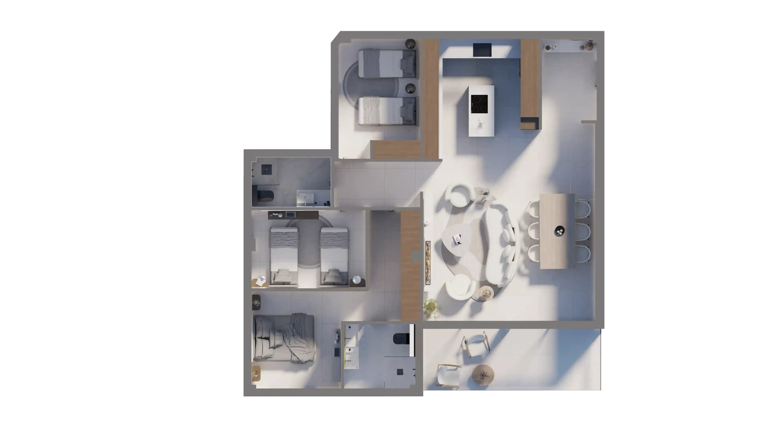 The open-plan kitchen with a central island is the heart of the home — a perfect balance of aesthetics and functionality. Bathrooms are conceived as private spas, with refined finishes and a soothing ambiance. Bedrooms are spacious, light-filled sanctuaries, designed for rest and relaxation in discreet sophistication.